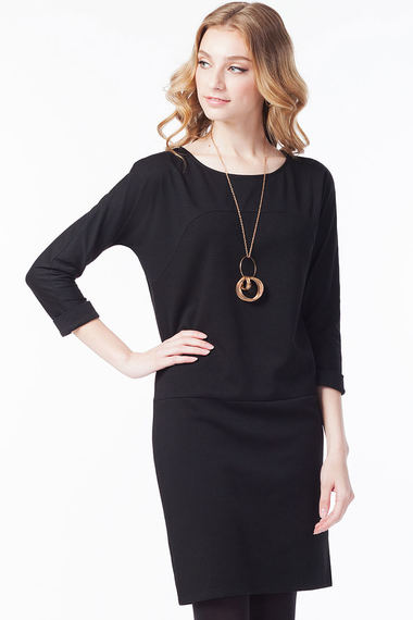 Платье прямого кроя с рукавами 3/4 и большой круглой горловиной. Трикотажное вискозное полотно средней плотности, длина до колена.